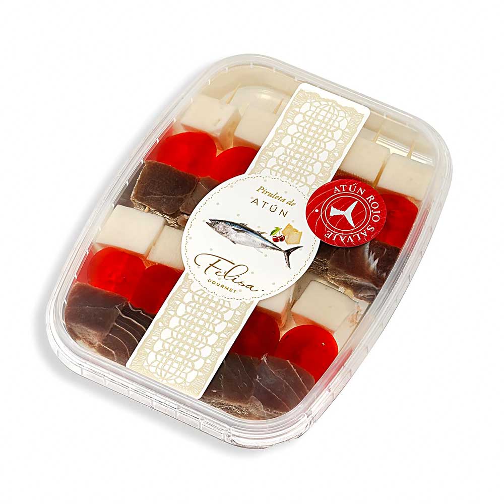 La Piruleta de Atún Ahumado FELISA Gourmet es una propuesta original y deliciosa para los amantes de los sabores intensos y equilibrados. Se trata de una banderilla elaborada con dados de atún ahumado, acompañados de guinda dulce y queso mezcla, creando una combinación única de matices dulces, salados y ahumados.